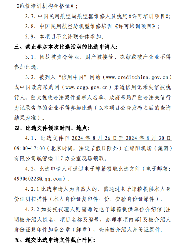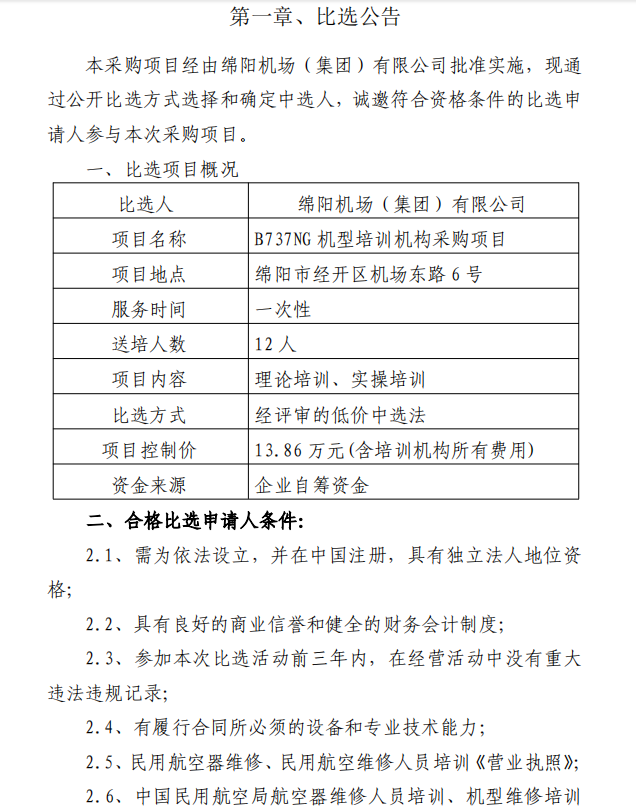 綿陽機場B737NG機型培訓(xùn)機構(gòu)采購項目比選公告