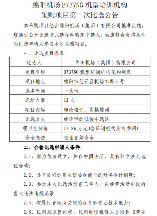 綿陽機(jī)場(chǎng)B737NG機(jī)型培訓(xùn)機(jī)構(gòu)采購(gòu)項(xiàng)目第二次比選公告